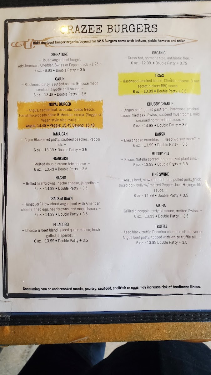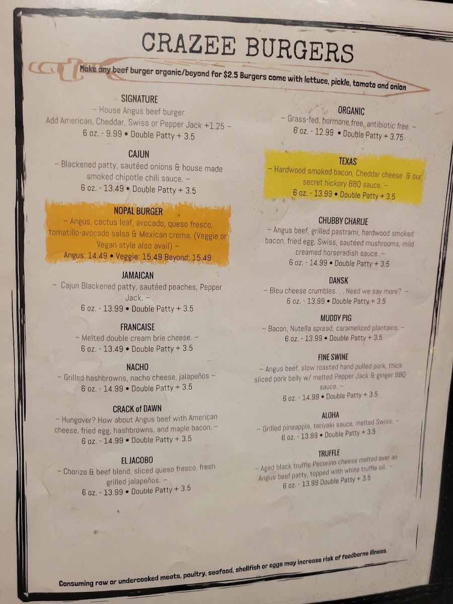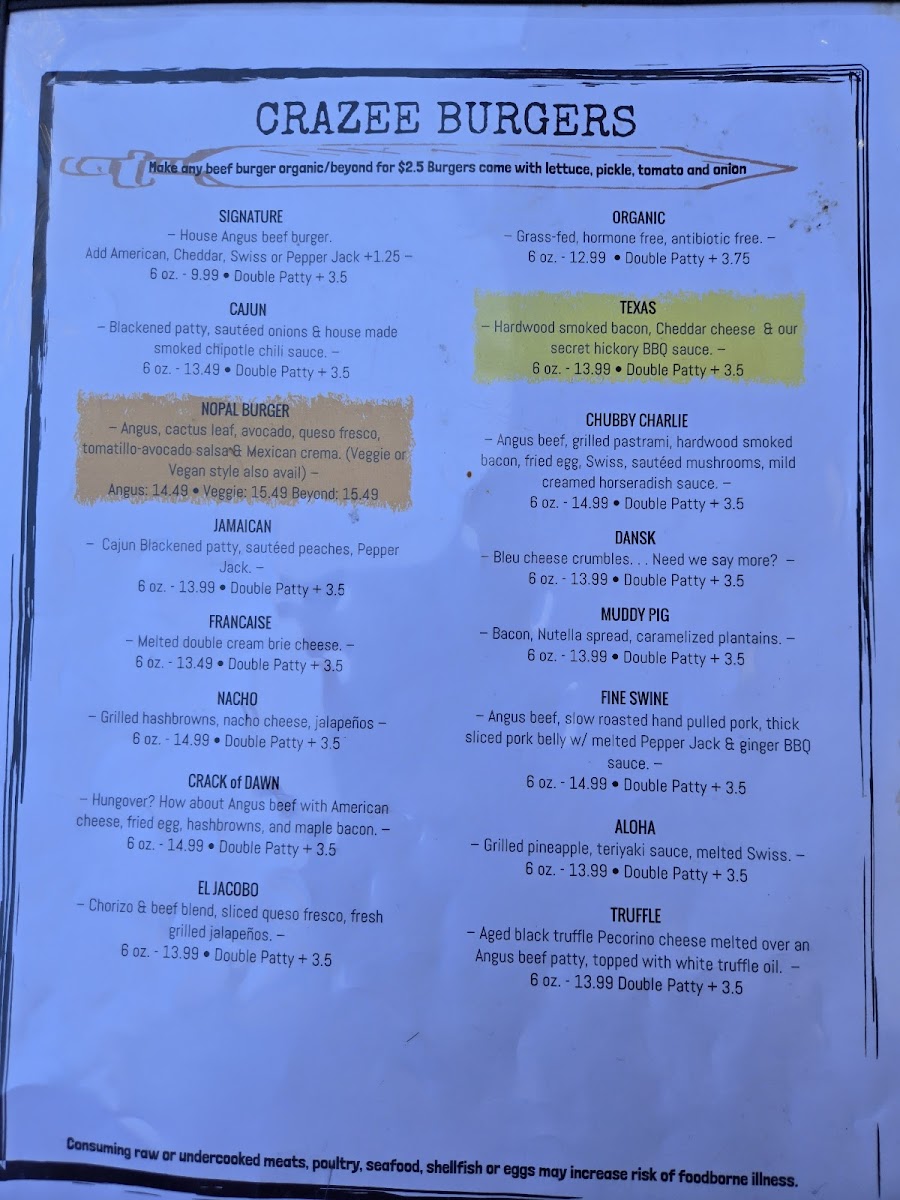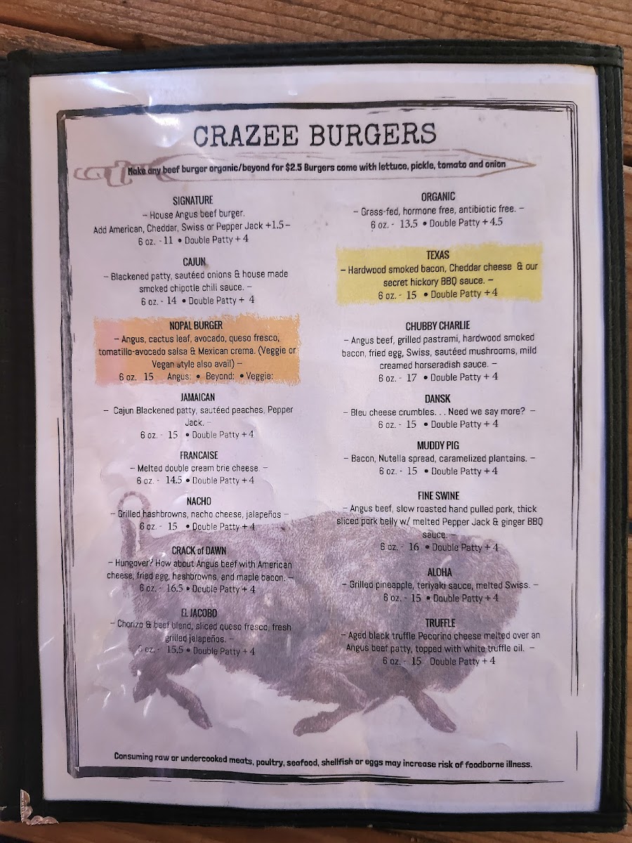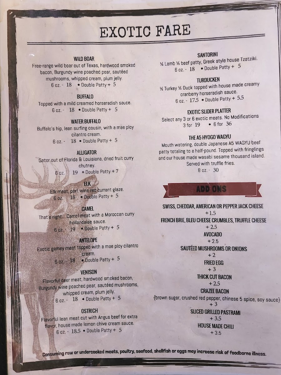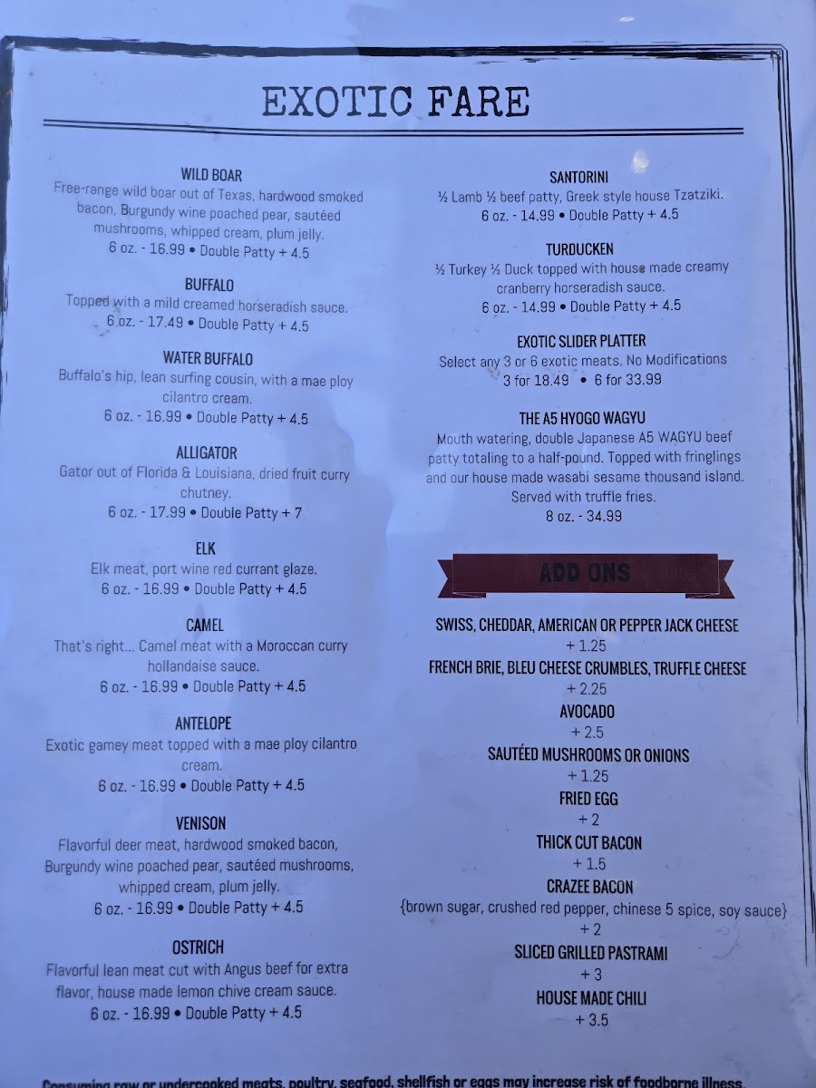 That's right ... Camel meat with a Moroccan curry hollandaise sauce. 6 oz. Double Patty + $4