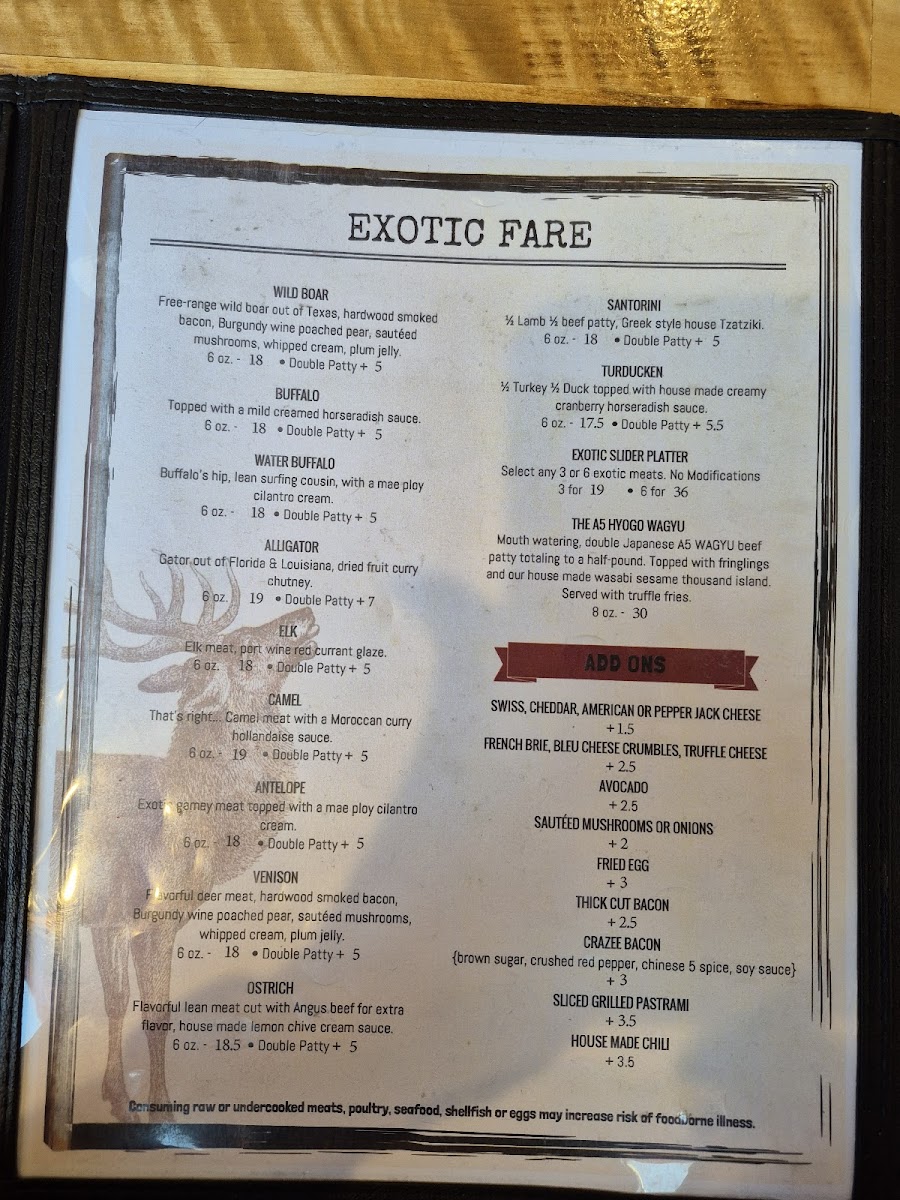 Exotic gamey meat topped with a mae ploy cilantro cream. 6 oz. Double Patty +$4